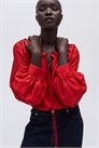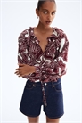 Блузка оверсайз из тканого материала с жабообразным воротником и V-образной проймой с завязками-спагетти спереди. Длинные рукава реглан с разрезом и застежкой на пуговицу на манжетах.