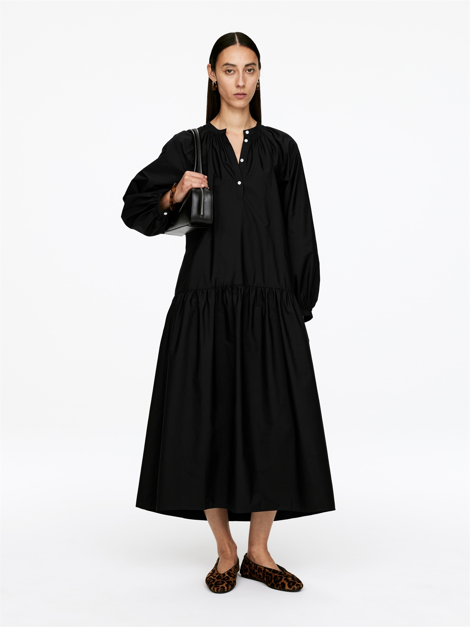 Платье миди из хлопка с рукавами реглан и манжетами на пуговицах, воротником-стойкой и полузастежкой на пуговицах спереди. Отрезные детали со сборками на талии, а также сборки у выреза горловины и на концах рукавов.