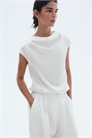 Блузка из мягко драпирующегося атласа с рукавами, вырезом-лодочкой и отверстием под замочную скважину с закрытыми пуговицами сзади на шее.