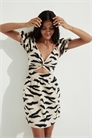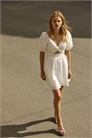 Короткое приталенное платье из хлопкового поплина с глубоким V-образным вырезом, перекрученной деталью и вырезом по центру бюста. Низкая спинка с широкой планкой, потайная застежка-молния с одной стороны и пышные рукава длиной до локтя с узкими эластичными манжетами. Частично на подкладке.