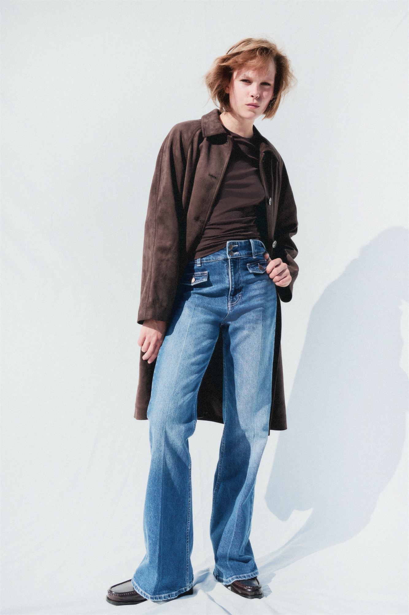 Джинсы из хлопкового денима с легким стретчем для комфорта. Расклешенные штанины с зауженной посадкой от талии до бедра и расклешенным кроем от колена до подола. Высокая талия, ширинка на молнии и пуговицах. Декоративные клапаны карманов с пуговицей спереди и накладные задние карманы. Удлиненная длина, созданная для того, чтобы ниспадать по ноге с эффектом укладки. Подходят ко всему: от кроп-топов до трикотажа.