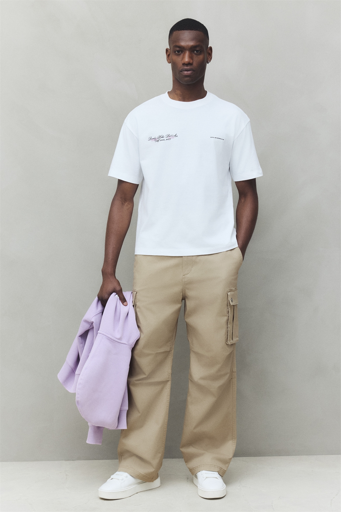 Брюки-карго из хлопкового полотна с вшитыми складками на коленях. Эластичная резинка на талии и ширинка на молнии с кнопкой. Диагональные боковые карманы, карманы на штанинах с кнопками и задние карманы с клапанами с кнопками. Свободный крой для пышного, но не чрезмерно большого силуэта.