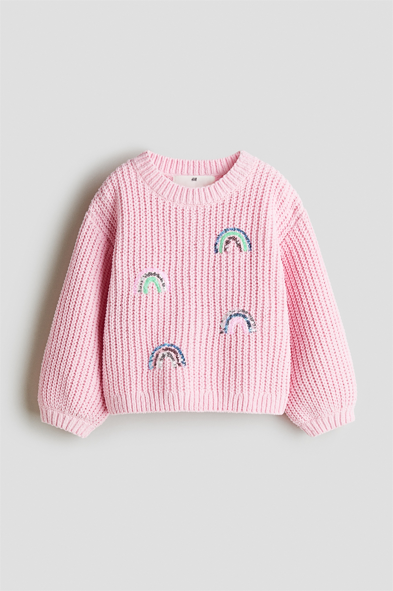 Джемпер из мягкого синельного трикотажа с бархатистой поверхностью. Круглый вырез с ребристой отделкой, спущенные плечи и длинные рукава. Ребристые манжеты и подол.