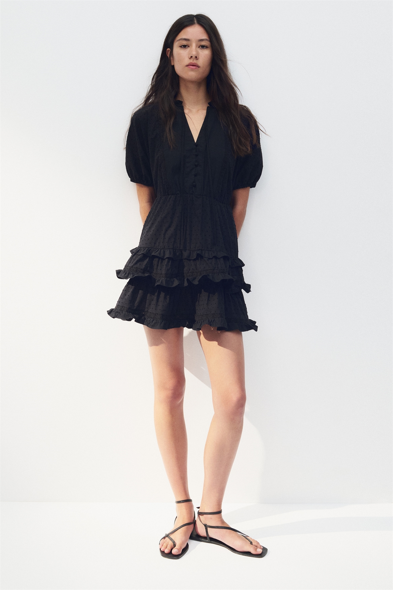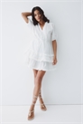 Короткое платье из хлопкового плуметика, украшенное вставками из бродери-англиза. Круглый вырез с оборками, глубокая V-образная пройма, узкие завязки спереди и сборки сзади. Застежка на пуговицы по низу лифа и рукава-баллон, заканчивающиеся чуть выше локтя. Присборенная резинка на талии и расклешенная юбка с ярусами из оборок. Без подкладки.