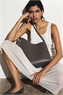 Сумка-шоппер из мелованной ткани с асимметричным кроем в верхней части. Длинный регулируемый плечевой ремень, скрытая магнитная застежка и внутреннее отделение на молнии. Металлические шипы внизу. Подкладка из саржи.