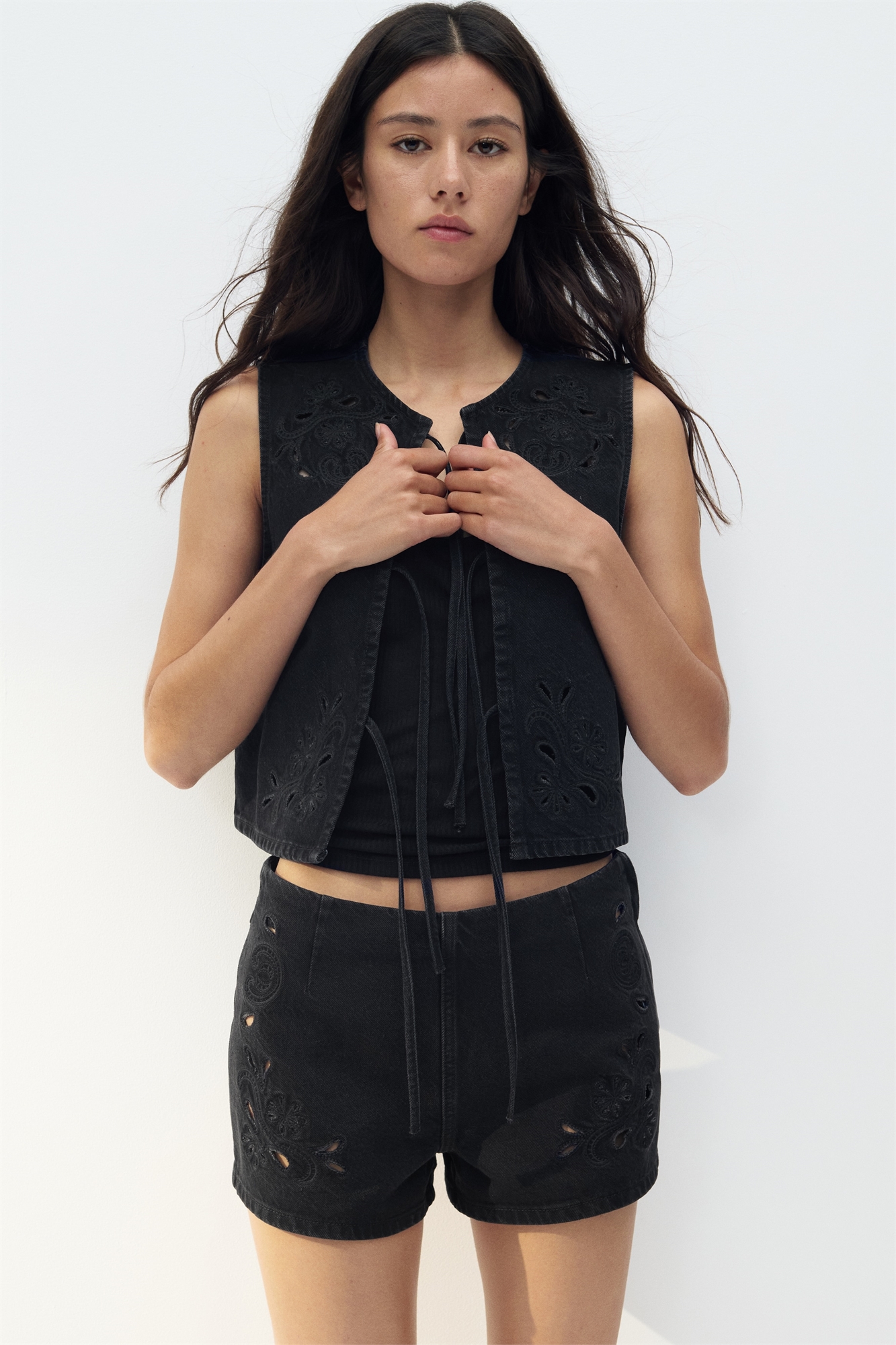 Облегающие шорты из жесткого хлопкового денима с детальным рисунком Broderie Anglaise. Высокая талия, застежка на молнию и потайную пуговицу с одной стороны.