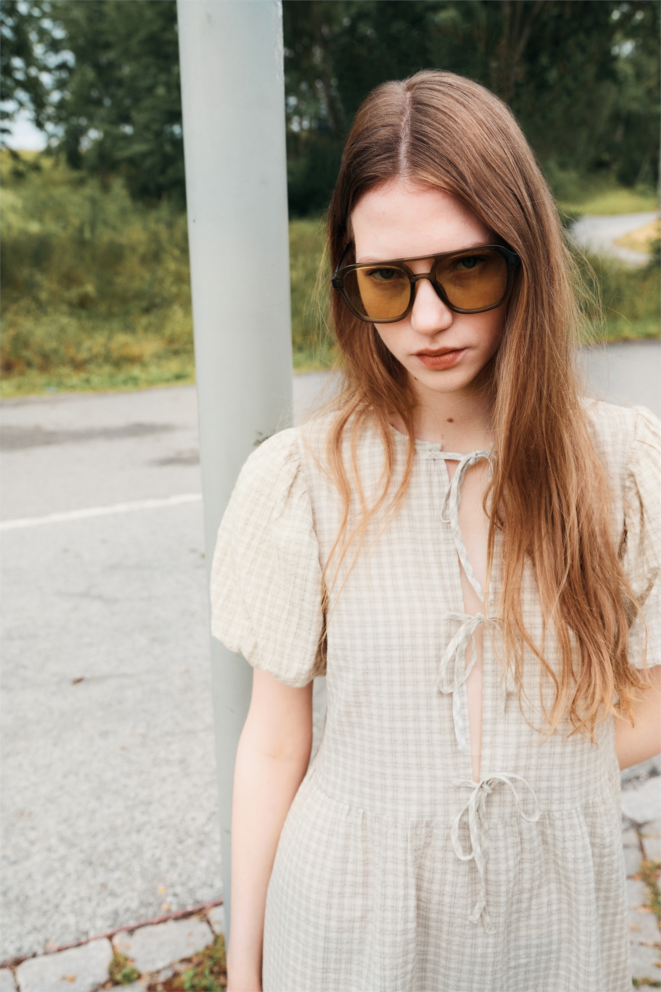Короткое платье свободного покроя из хлопкового полотна с круглым вырезом и проймой с тремя завязками спереди. Короткие пышные рукава на подкладке, сборчатый шов на талии и слегка расклешенная юбка.
