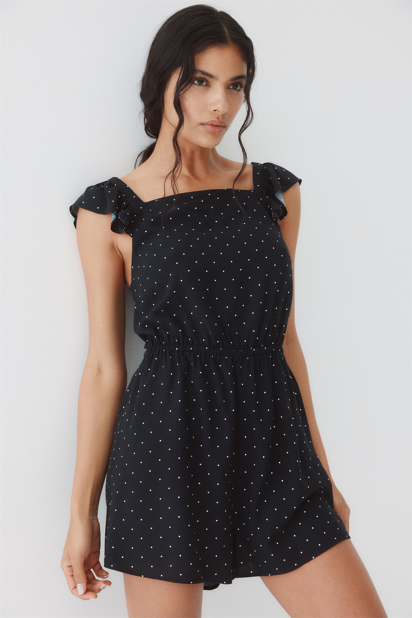 Купальник из вискозного полотна с квадратным вырезом и широкими бретелями с воланами. Широкие завязки сзади и эластичная резинка на талии.