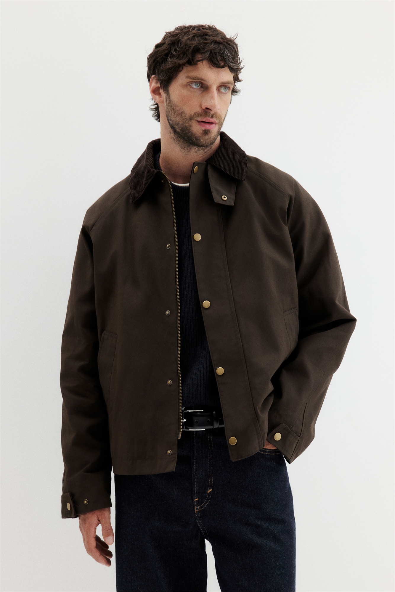 Куртка из вощеной хлопковой саржи с вельветовым воротником. Застежка-молния и ветрозащитная планка с прижимами спереди, длинные рукава реглан с регулируемыми манжетами с прижимами, диагональные боковые карманы и внутренний карман с прижимами. Свободный крой для пышного, но не слишком большого силуэта. На подкладке.