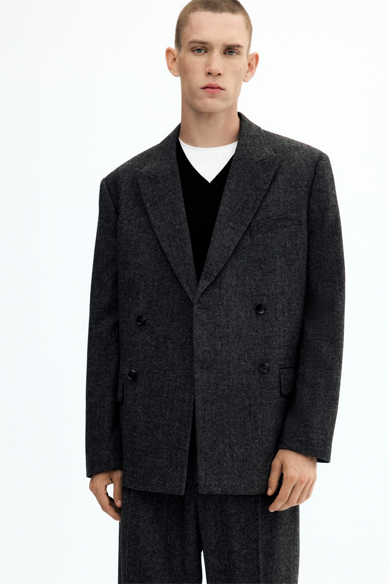 Двубортный пиджак из войлочной ткани с добавлением шерсти. Лацканы с пике и декоративной петлей для пуговицы, нагрудный карман, прорезные передние карманы с клапаном и три внутренних кармана. Декоративные пуговицы на манжетах и двойной задний клапан. Свободный крой для непринужденного, но не чрезмерного силуэта. На подкладке.