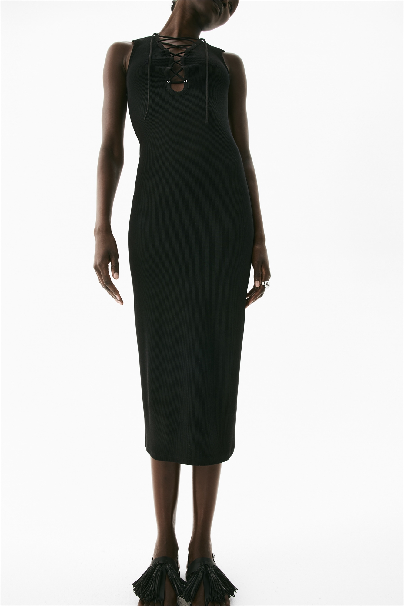 Приталенное платье длиной до колен из ребристого джерси, без рукавов и с глубоким вырезом со шнуровкой спереди.