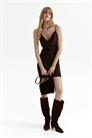 Короткое приталенное платье из тканого материала с бретельками-спагетти, вырезом-лодочкой и рюшами на талии с одной стороны, создающими эффект драпировки.