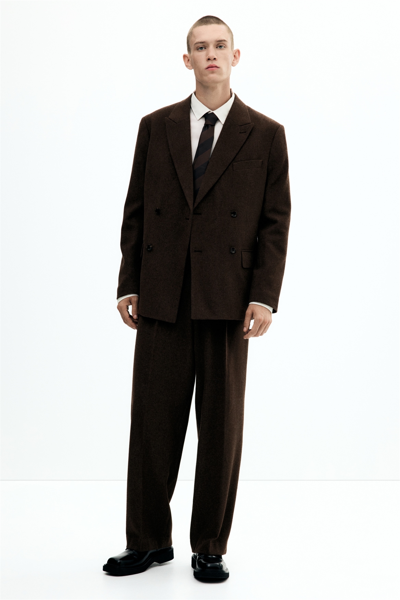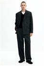 Приталенные брюки из мягкого шерстяного микса с ширинкой на молнии и поясом со скрытой застежкой на пуговицу и крючок. Диагональные боковые карманы, втачные задние карманы и широкие ноги со складками. Свободный крой для пышного, но не чрезмерно большого силуэта.