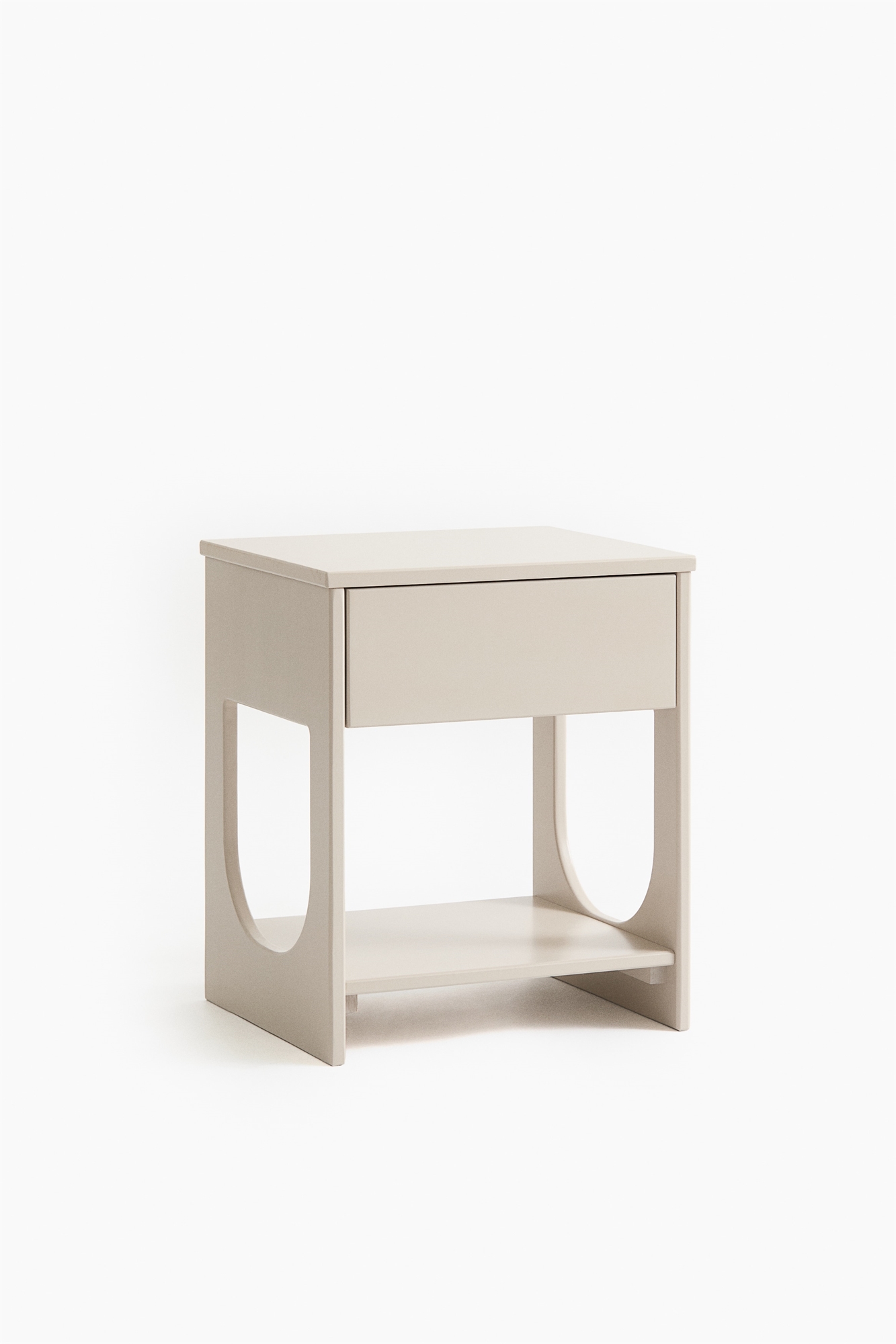 Прикроватная тумбочка из соснового дерева прямоугольной формы с закругленными вырезами по бокам и практичным выдвижным ящиком. Поставляется в плоской упаковке, готовая к сборке.