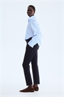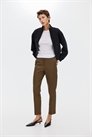 Брюки-сигареты длиной до щиколотки из эластичного материала. Регулярная талия со скрытой эластичной резинкой, ширинка на молнии со скрытой застежкой на крючок и глазок, боковые карманы, фальшивые задние карманы и зауженные ноги.