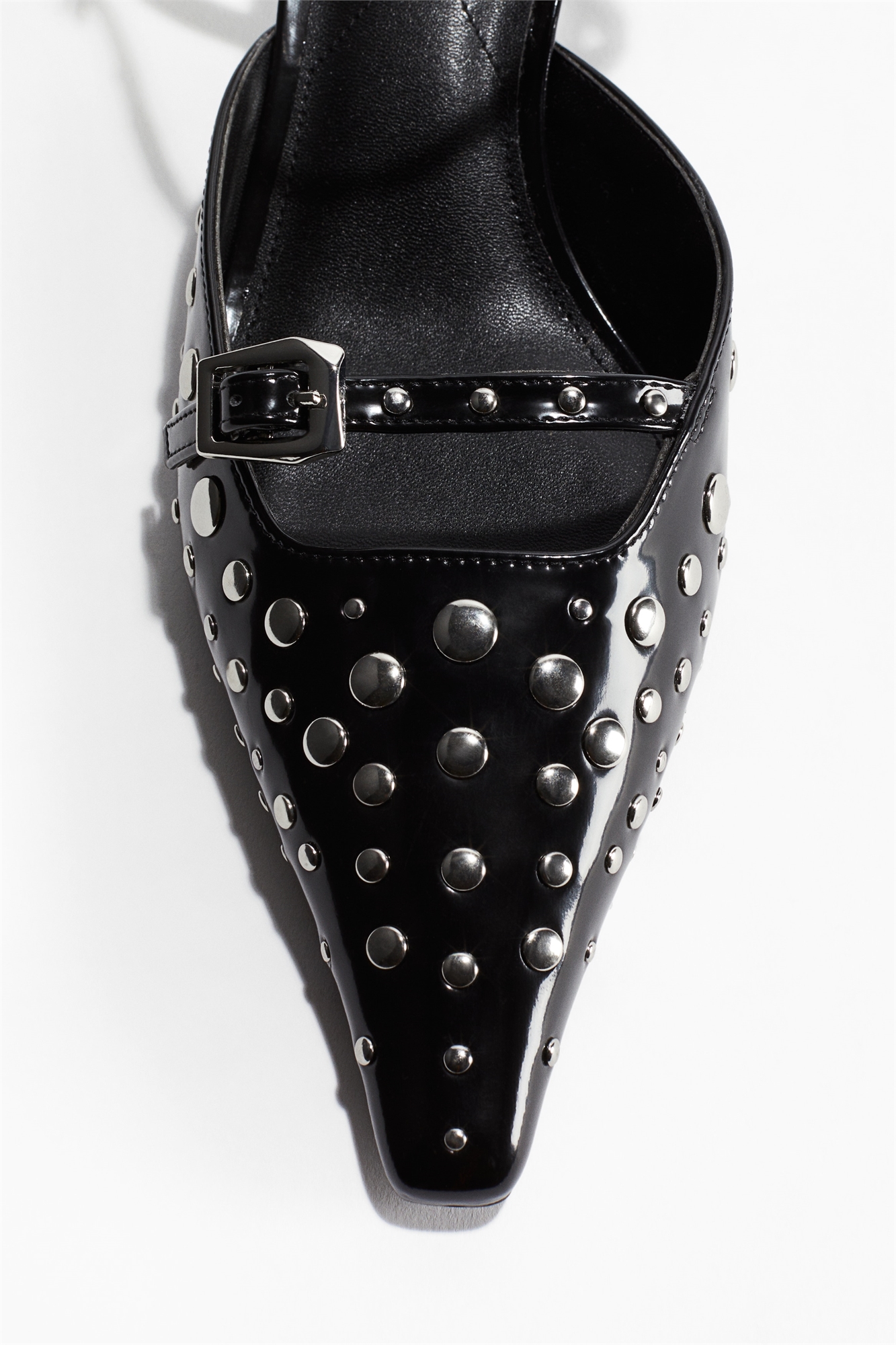 Сандалии из мелованной ткани, украшенные металлическими шипами. Заостренные носки и узкий регулируемый ремешок спереди. Регулируемый ремешок на щиколотке и закрытый каблук.