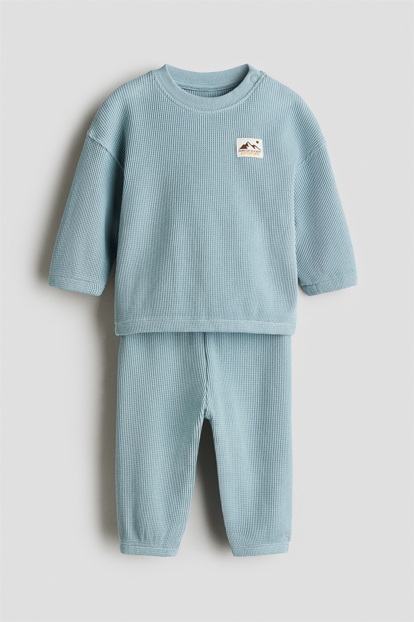 Комплект из топа и джоггеров из мягкого вафельного хлопка. Топ с круглым вырезом с ребристой отделкой и застежками с одной стороны (кроме размеров 2-4Y), спущенными плечами и длинными рукавами с эластичными манжетами. Джоггеры с регулируемой, эластичной талией с декоративным шнурком и эластичными вставками по краям.