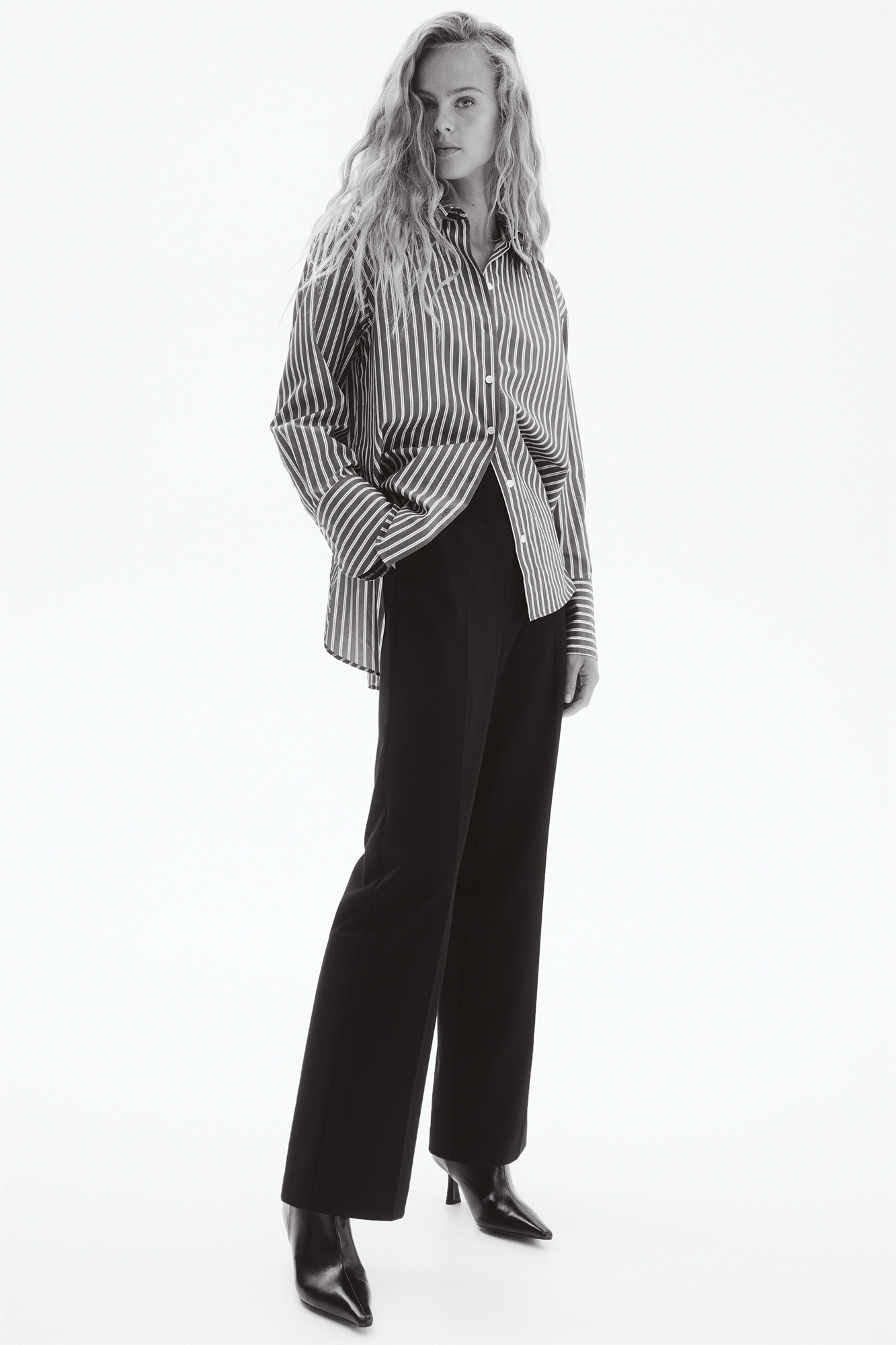 Брюки из тканого материала с высокой талией, ширинкой на молнии и скрытой застежкой на пуговицу и крючок. Диагональные боковые карманы, втачные задние карманы и прямые ноги со складками спереди и сзади.
