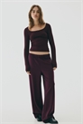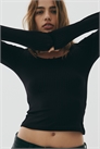 Короткий приталенный топ из ребристого трикотажа с длинными рукавами и глубоким вырезом с кружевной отделкой и нежным атласным бантом по центру.