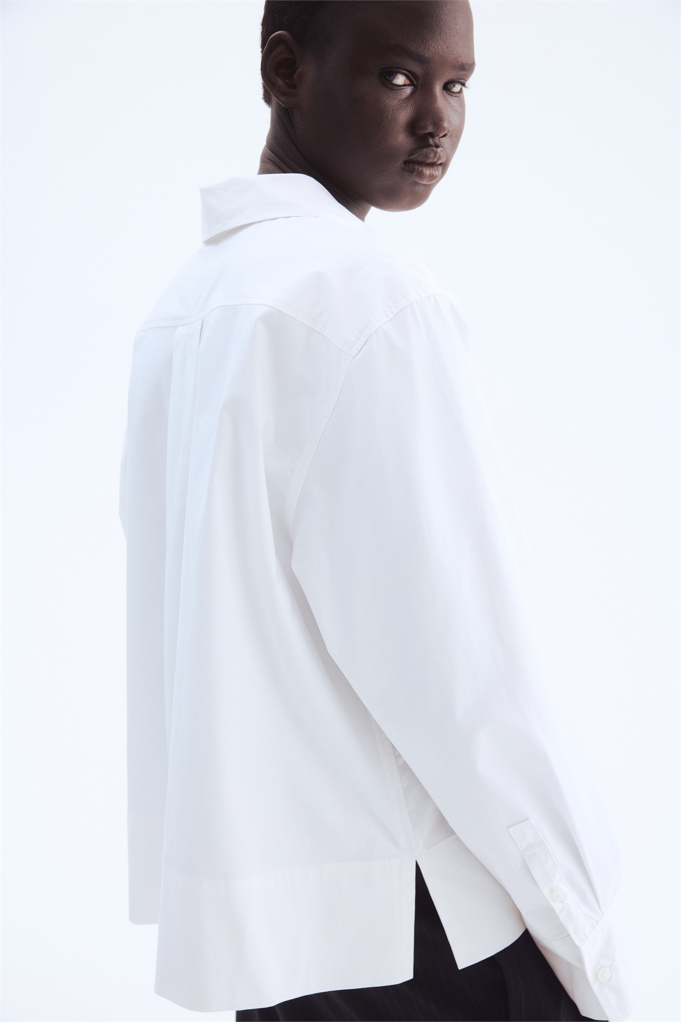 Рубашка оверсайз из хлопковой саржи с воротником и пуговицами спереди. Длинные рукава с манжетами на пуговицах и рукавной планкой с пуговицей. Подол прямого кроя с разрезом с каждой стороны.