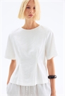 Блузка из саржи с круглым вырезом, потайной застежкой-молнией сзади и короткими рукавами. Складки на талии придают силуэту облегающий вид.