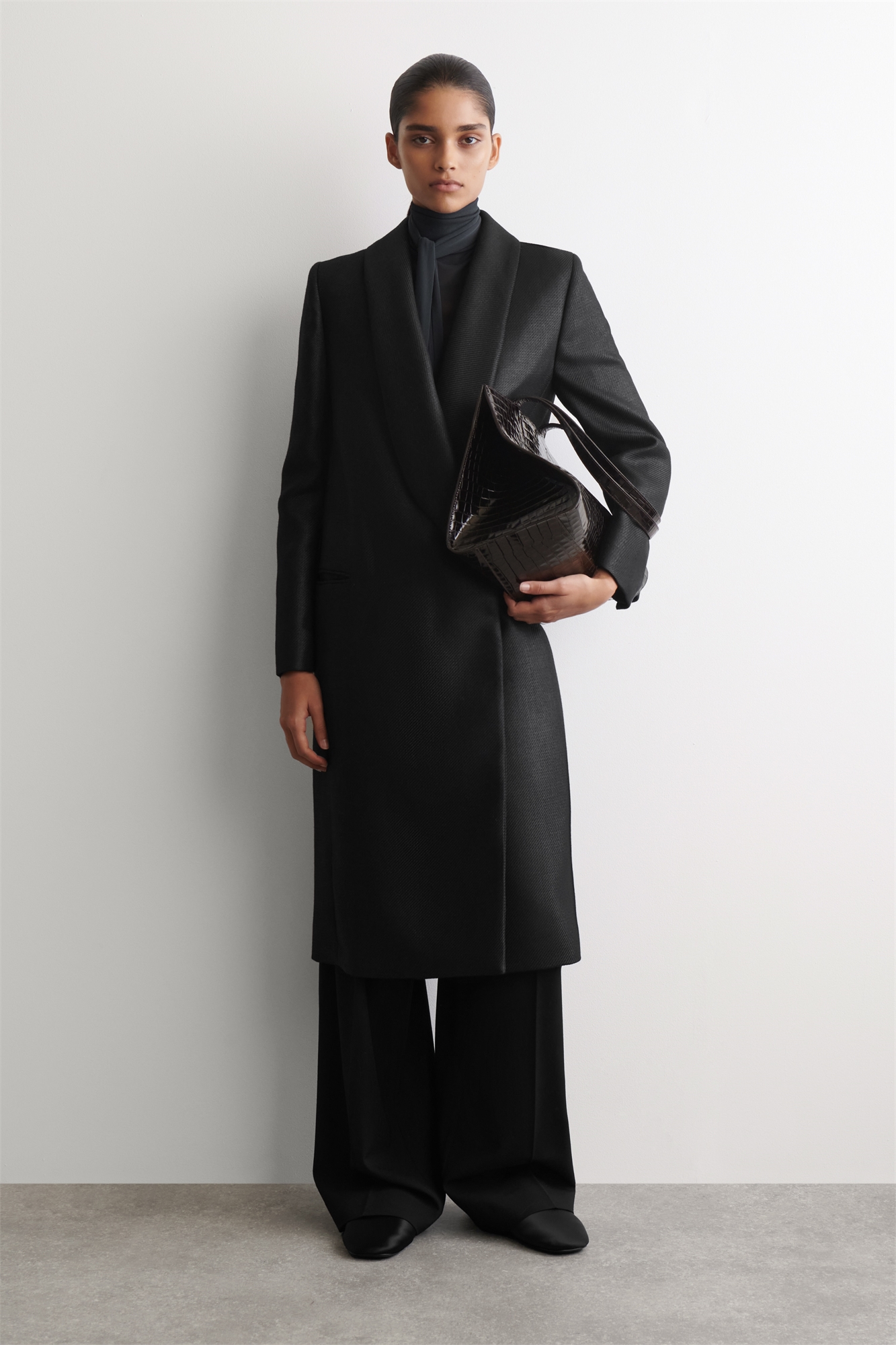 Приглушенный металлический цвет придает классическому пальто новую изысканность. Это изысканное изделие сшито из тактильной шерстяной саржи RWS, которая тонко переливается на свету, и имеет удлиненные шалевые лацканы, которые смягчают прямой силуэт.