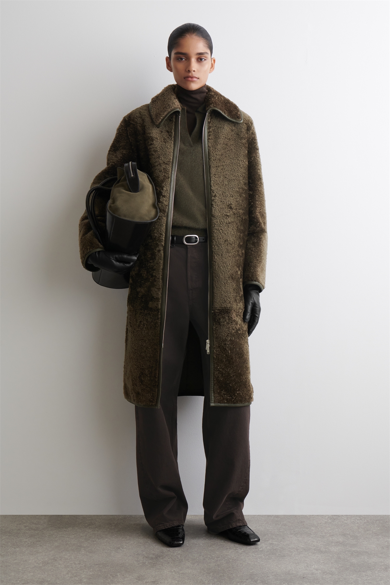 Представляем пальто из овечьей шерсти COS: икона гардероба осенне-зимнего сезона. Эта удлиненная модель сшита из первоклассной овчины насыщенного цвета хаки, а ее края отделаны кожей для роскошной отделки. Модель застегивается на двустороннюю молнию, имеет боковые карманы и дополнительные карманы внутри.
