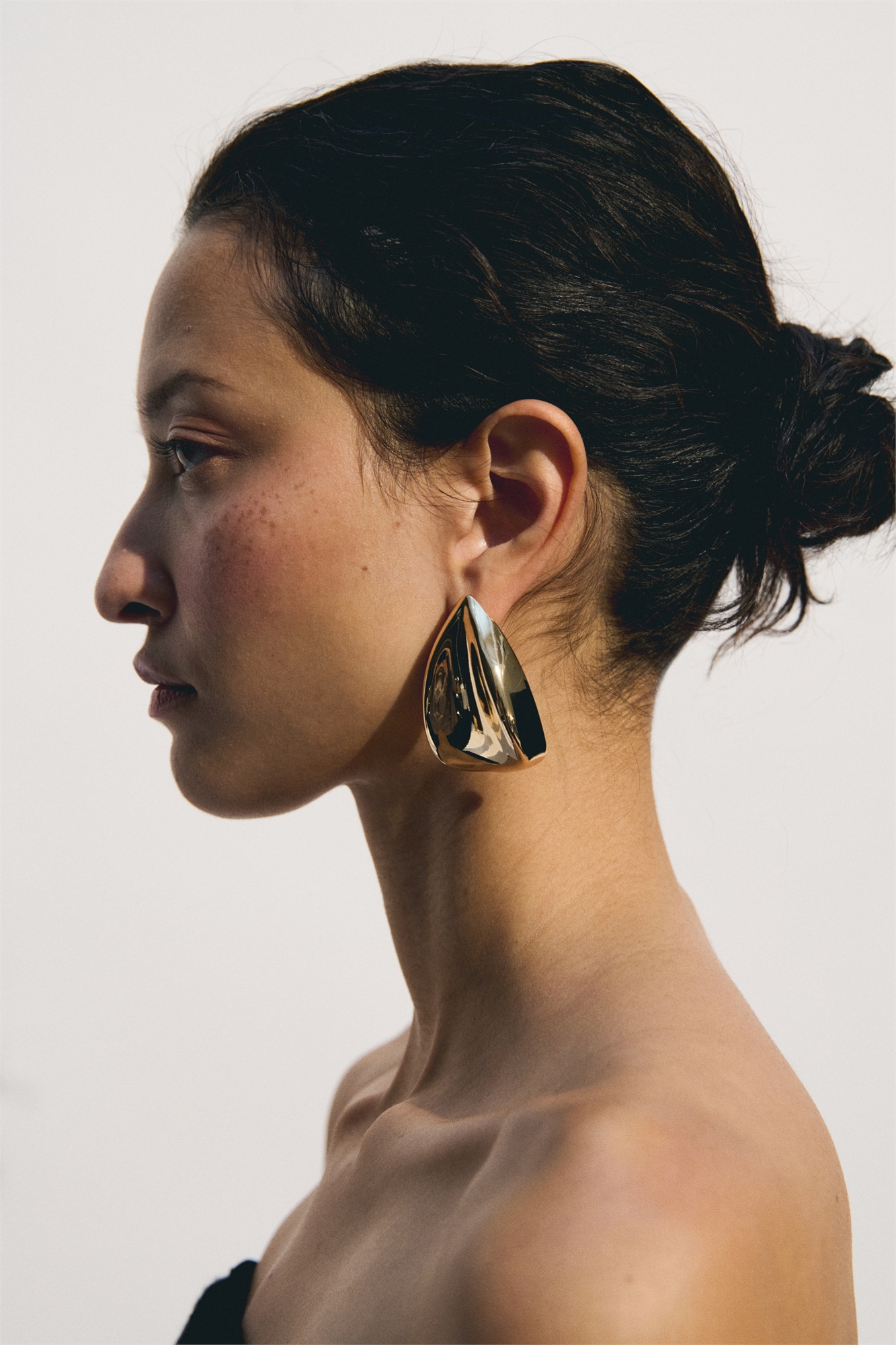 Крупные серьги-шпильки из блестящего металла в форме капли с выемкой спереди.