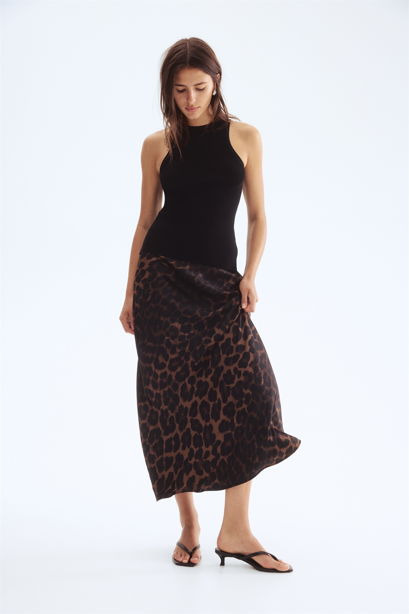 Юбка длиной до колен из мягко драпирующегося атласа из смеси вискозы. Высокая талия со скрытой эластичной резинкой и вытачками сзади для комфортной посадки на животе. Скрытая застежка-молния и застежка-крючок с одной стороны. Без подкладки.