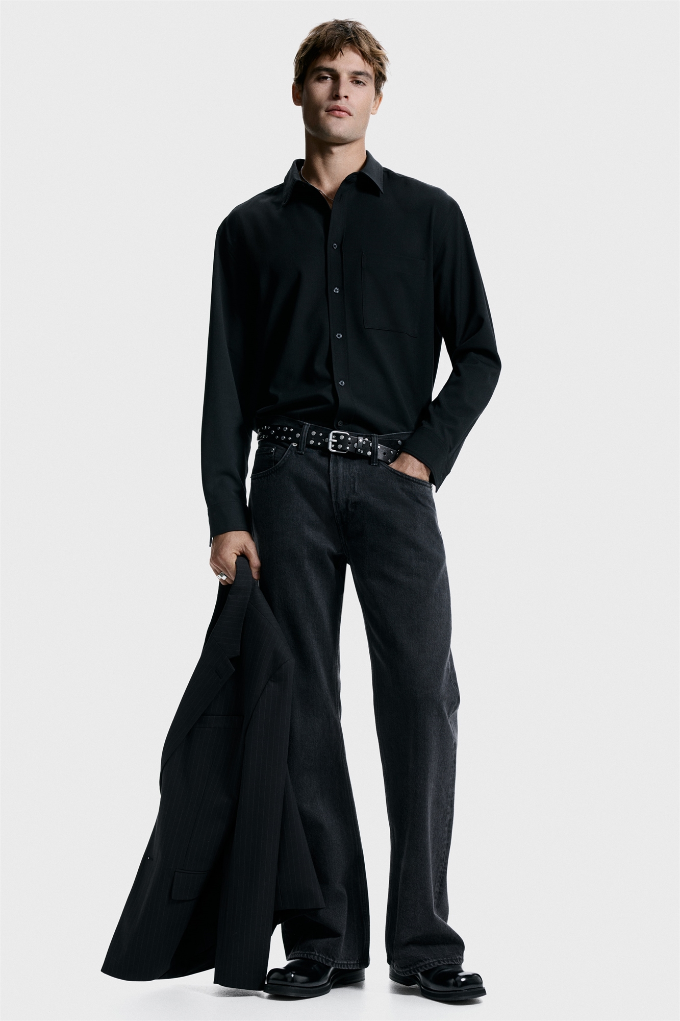 Рубашка из мягкого полотна с отложным воротником, классическим передом, передом с боковыми складками и открытым нагрудным карманом. Длинные рукава с манжетами на пуговицах и аккуратно закругленный подол. Регулярный крой для комфортной носки и классического силуэта.