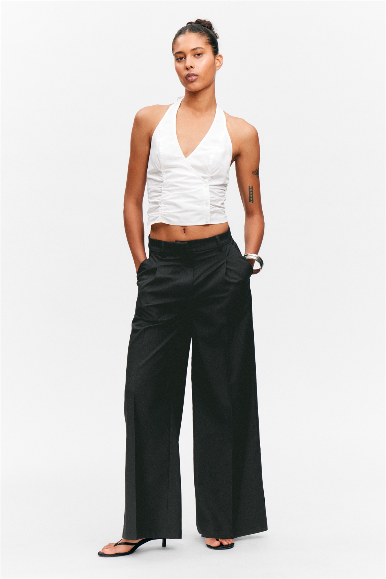 Костюмные брюки с высокой талией, свободным кроем и широкими штанинами. Брюки сшиты из структурированной саржи и украшены острыми складками спереди, косыми боковыми карманами, петлями для ремня и застежкой-молнией на крючке.