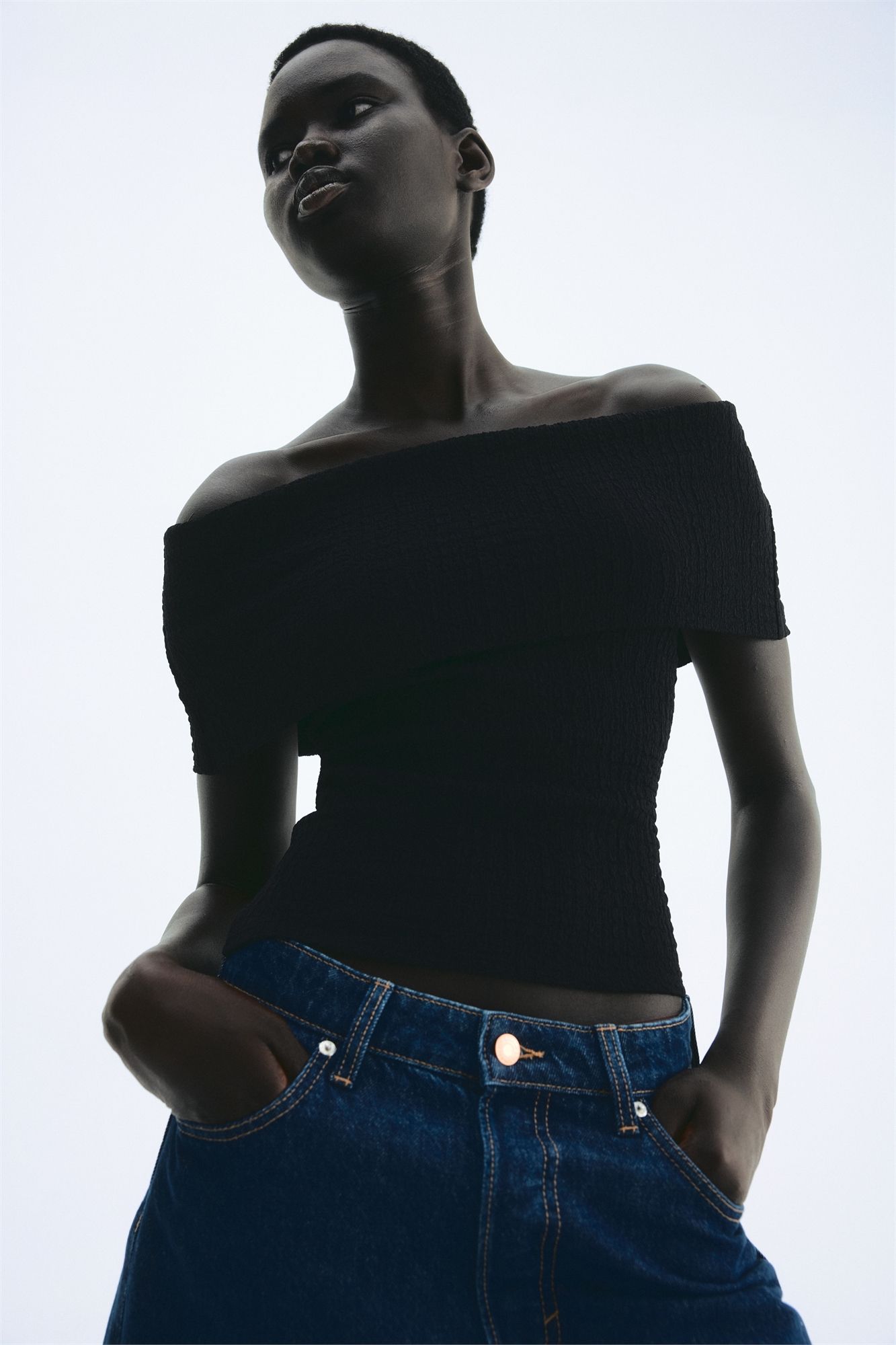 Облегающий топ без плеч из фактурного джерси с широкой складкой в верхней части.