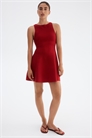 Короткое платье без рукавов из тонкого трикотажа в рубчик с вырезом-лодочкой, приталенным лифом и расклешенной юбкой.