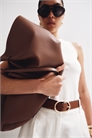 Ремень из ткани с покрытием и овальной металлической пряжкой с кованой поверхностью.