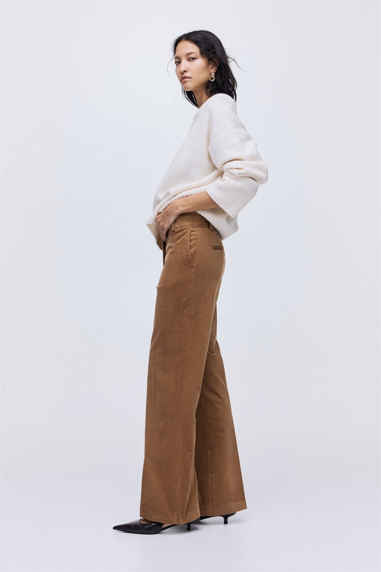 Брюки из мягкого хлопкового вельвета с высокой талией, ширинкой на молнии и удлиненным поясом со скрытой застежкой на пуговицу и крючок-штангу. Диагональные боковые карманы, втачные задние карманы и облегающие ноги со складками спереди и сзади.