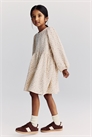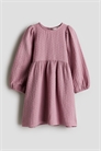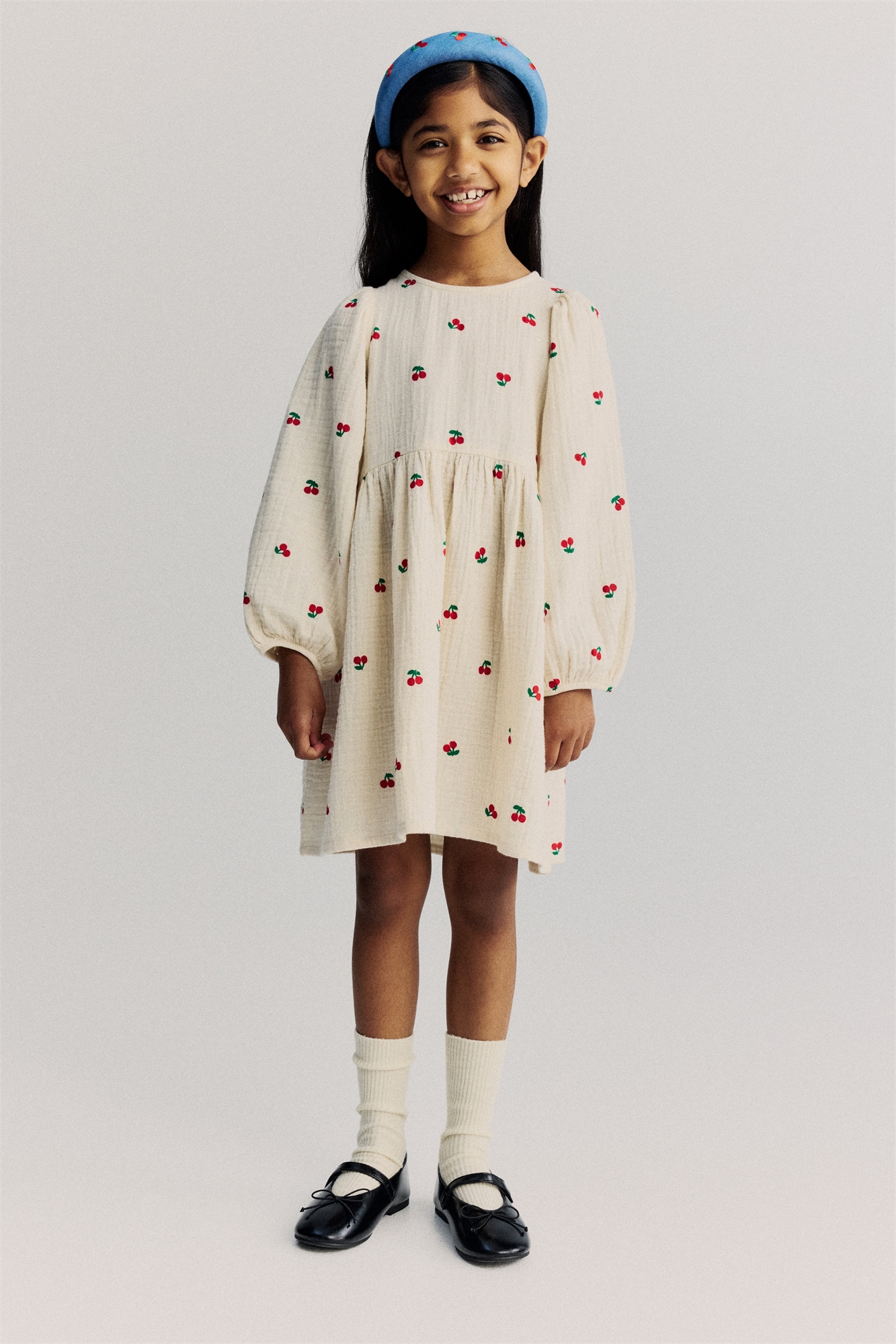 Платье из мягкого хлопкового муслина с принтом по всей поверхности. Круглый вырез с отверстием для ключа и пуговицей сзади, длинные рукава-баллоны с эластичными манжетами и сборчатым швом на талии. Удлиненные сзади.