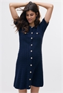 Короткое платье из хлопкового микса с ребристой вязкой, круглым вырезом и пуговицами спереди. Нагрудные карманы, короткие рукава и расклешенная юбка.