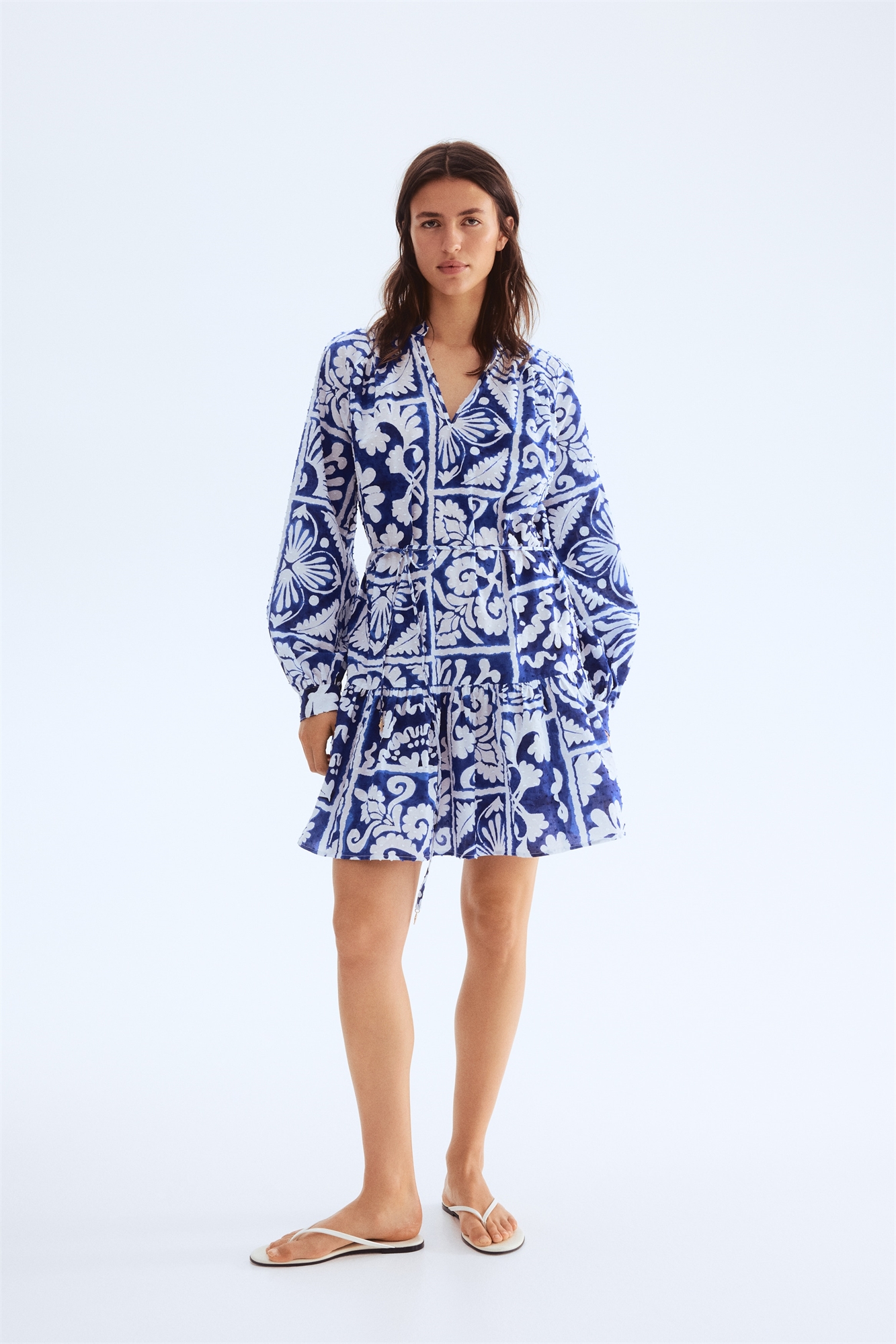 Короткое платье из хлопкового плуметика с воротником-бантом и V-образной проймой спереди. Длинные рукава реглан с манжетами на пуговицах и съемный пояс с завязками-спагетти с подвесками в морской тематике. Ярусная сборка ниже бедер для придания объема. Без подкладки.