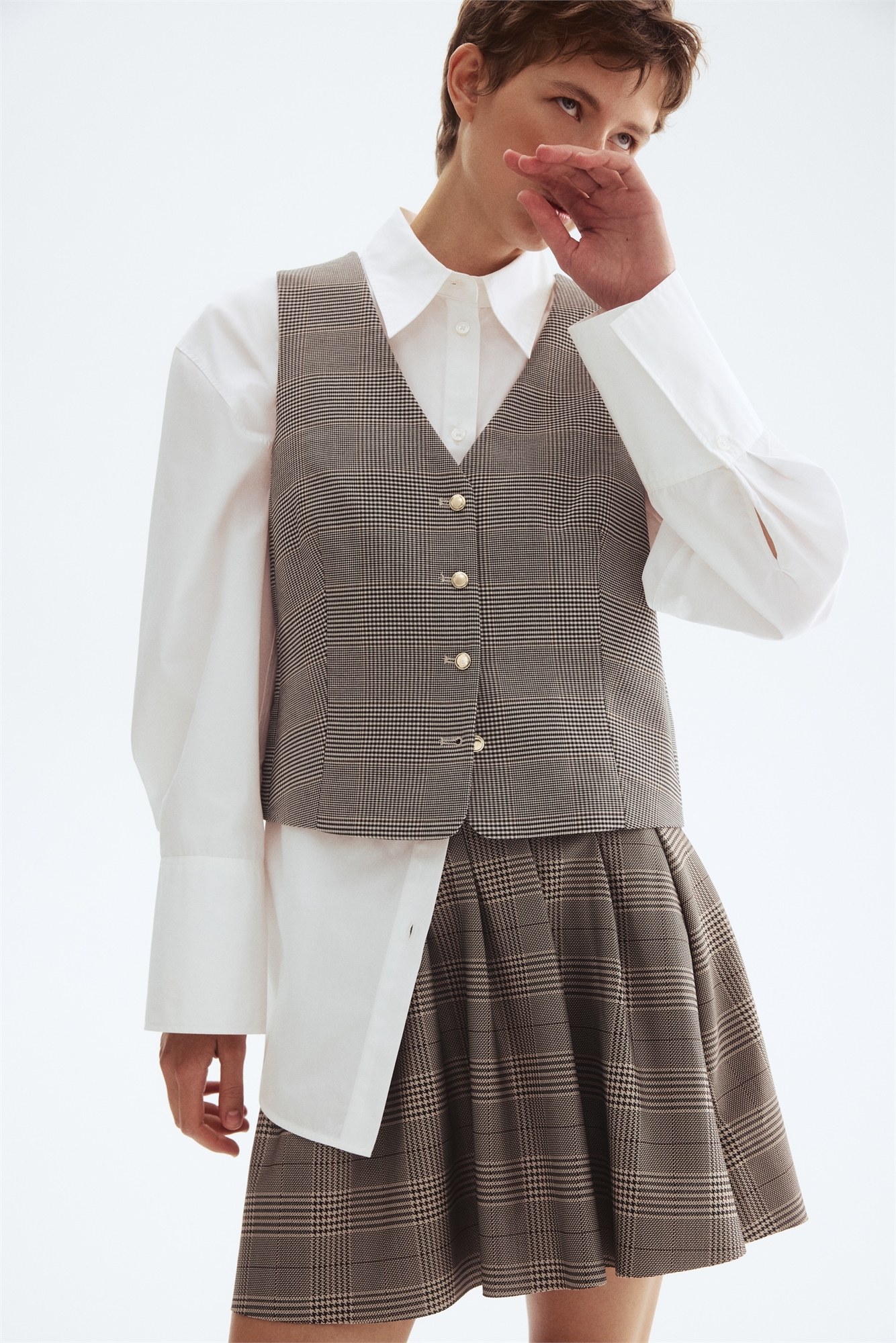 Приталенный жилет из тканого материала с V-образным вырезом и пуговицами спереди. На подкладке.
