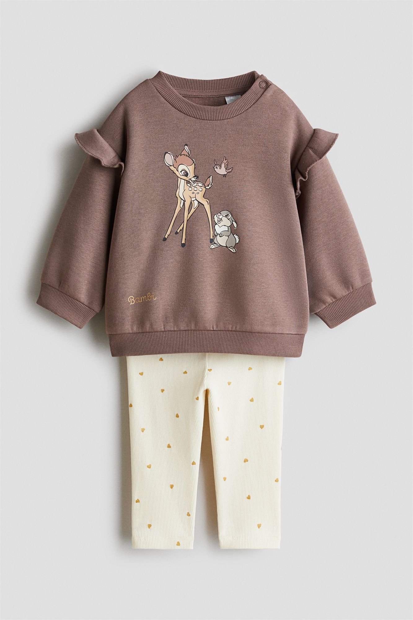 Комплект с принтом: топ из толстовки и леггинсы из мягкого трикотажа, оба из хлопка. Топ с круглым вырезом в рубчик с застежками с одной стороны (кроме размеров 2-4Y), спущенными плечами и окантовкой манжет и подола. Леггинсы с регулируемой эластичной талией.