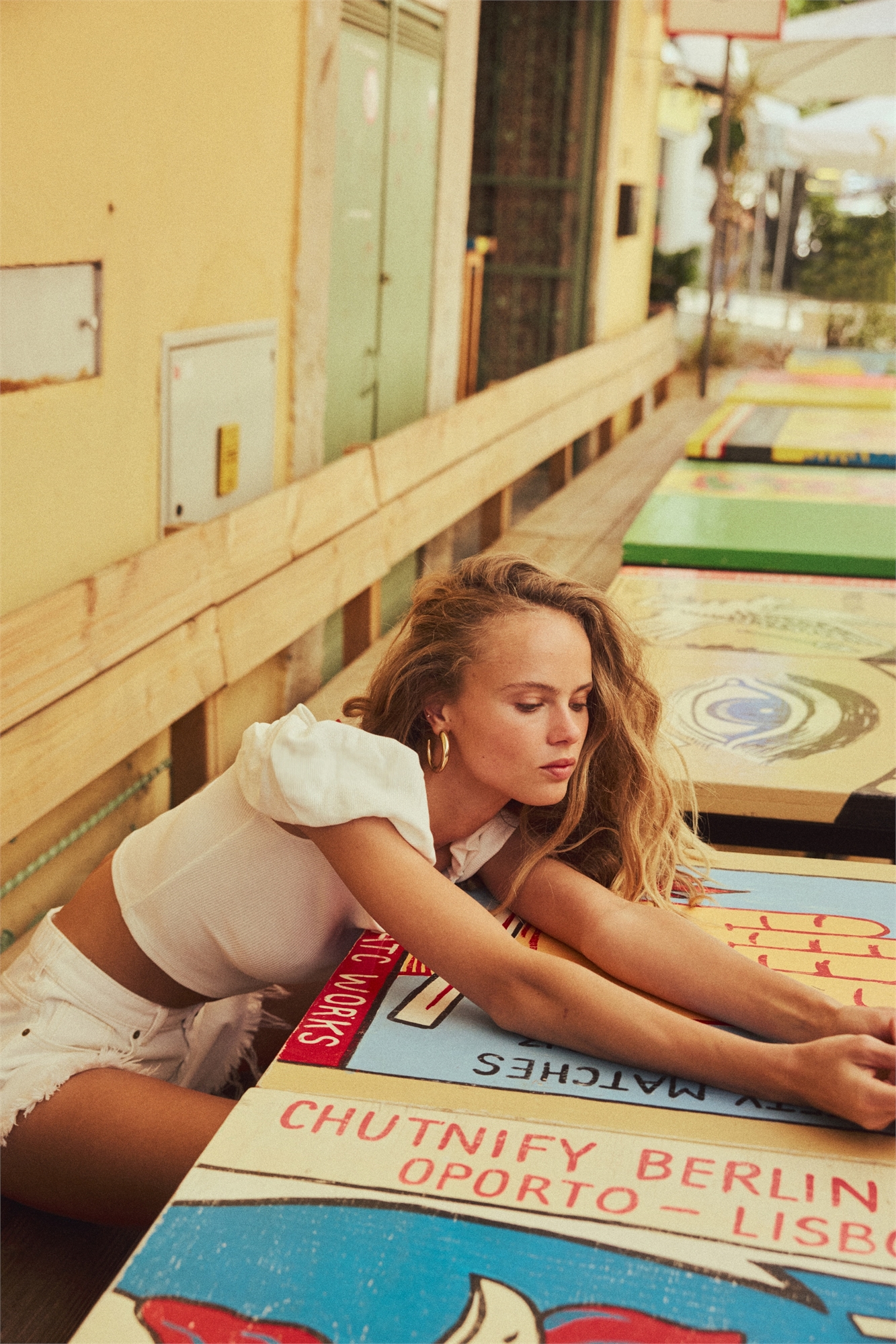 Короткий приталенный топ без плеч из ребристого трикотажа с короткими пышными рукавами с эластичной отделкой.