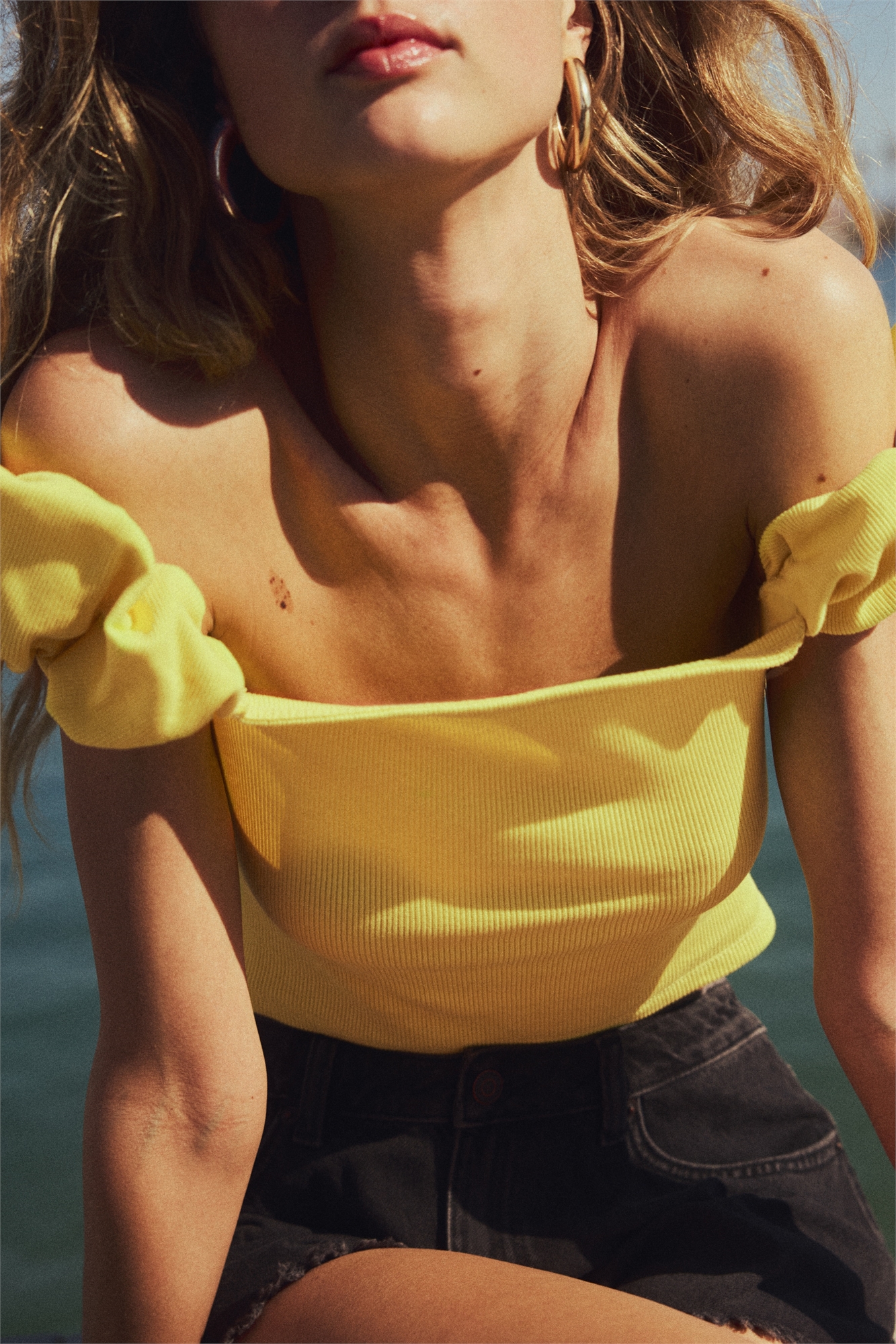 Короткий приталенный топ без плеч из ребристого трикотажа с короткими пышными рукавами с эластичной отделкой.