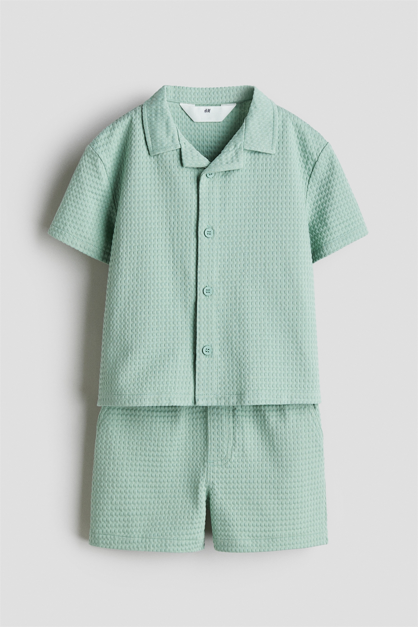 Комплект из курортной рубашки и пары подходящих шорт из мягкого, фактурного джерси. Рубашка с короткими рукавами, курортным воротником и пуговицами спереди. Шорты с регулируемой эластичной резинкой на талии, фальшивой ширинкой, диагональными боковыми карманами и открытым задним карманом.