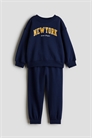 Комплект из топа и джоггеров из легкой толстовочной ткани с начесом внутри и принтом. Топ с круглым вырезом в рубчик, спущенными плечами, окантовкой манжет и подола. Джоггеры с эластичной утягивающейся талией и эластичными вставками на подоле.