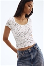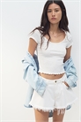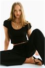 Короткий приталенный топ из мягкого ребристого трикотажа с круглым вырезом с кружевной отделкой. Короткие рукава с манжетами с кружевной отделкой и оверлоком по подолу.
