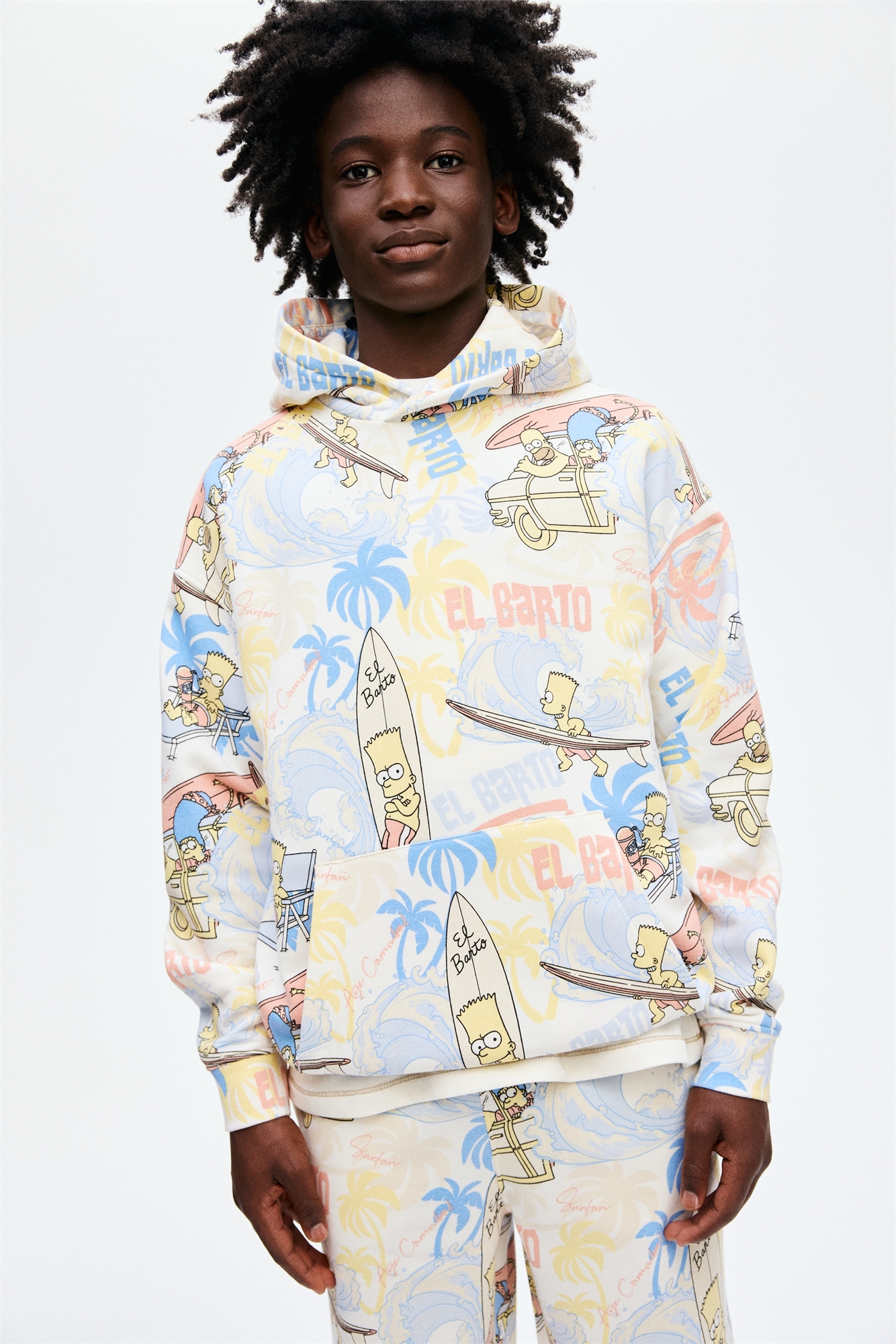 Толстовка свободного кроя из принтованной ткани с мягкой начесом внутри. Капюшон на подкладке, накинутый спереди, с опущенными плечами и карманом-кенгуру спереди. Длинные рукава и окантовка манжет и подола.
