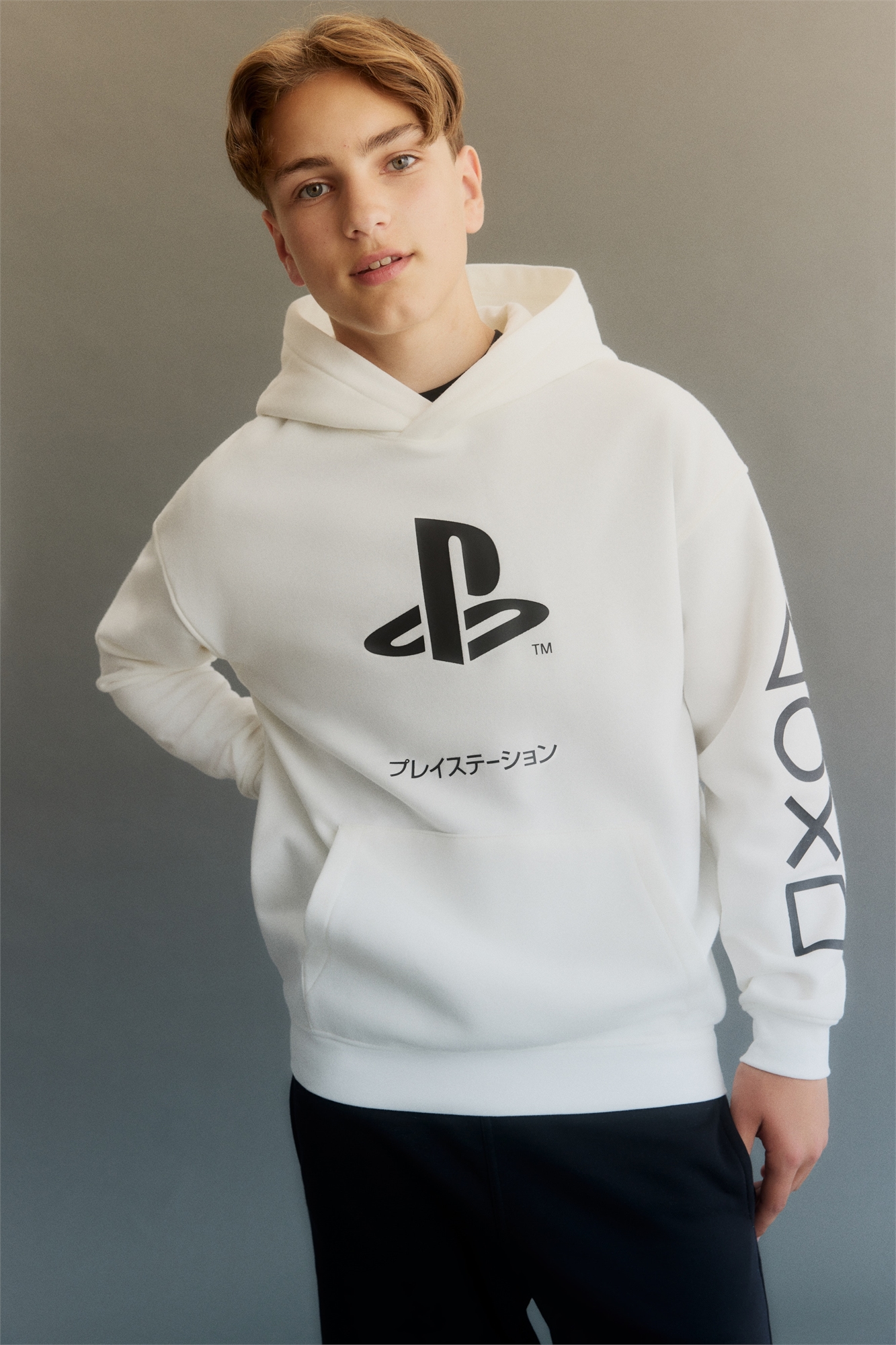 Толстовка свободного кроя из принтованной ткани с мягкой начесом внутри. Капюшон на подкладке, накинутый спереди, с опущенными плечами и карманом-кенгуру спереди. Длинные рукава и окантовка манжет и подола.