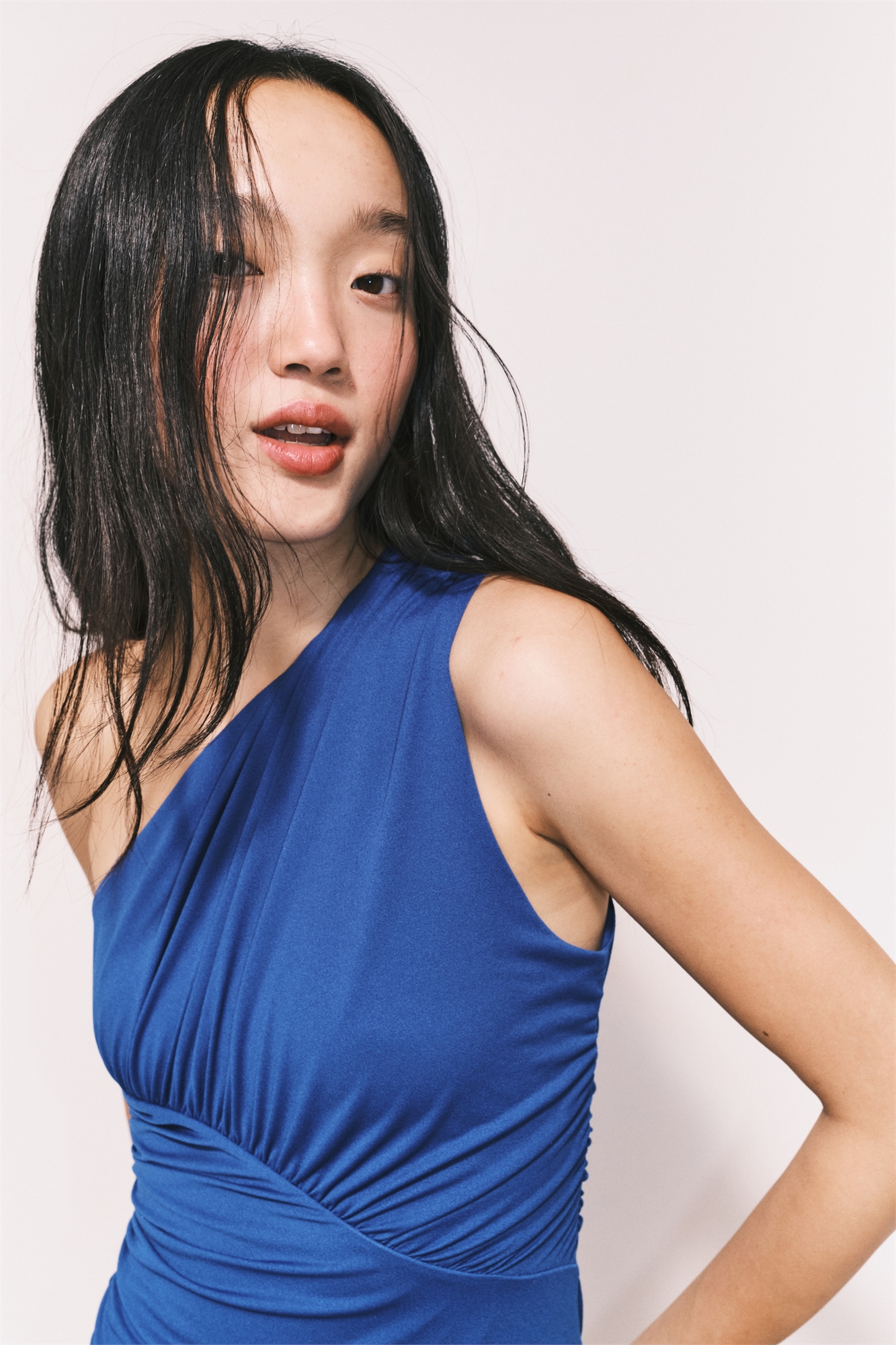 Боди стринги из мягкого джерси с одной широкой бретелью. Спереди, с одной стороны и на плече - шов с начесом, создающий эффект легкой драпировки. Скрытые кнопки в промежности.