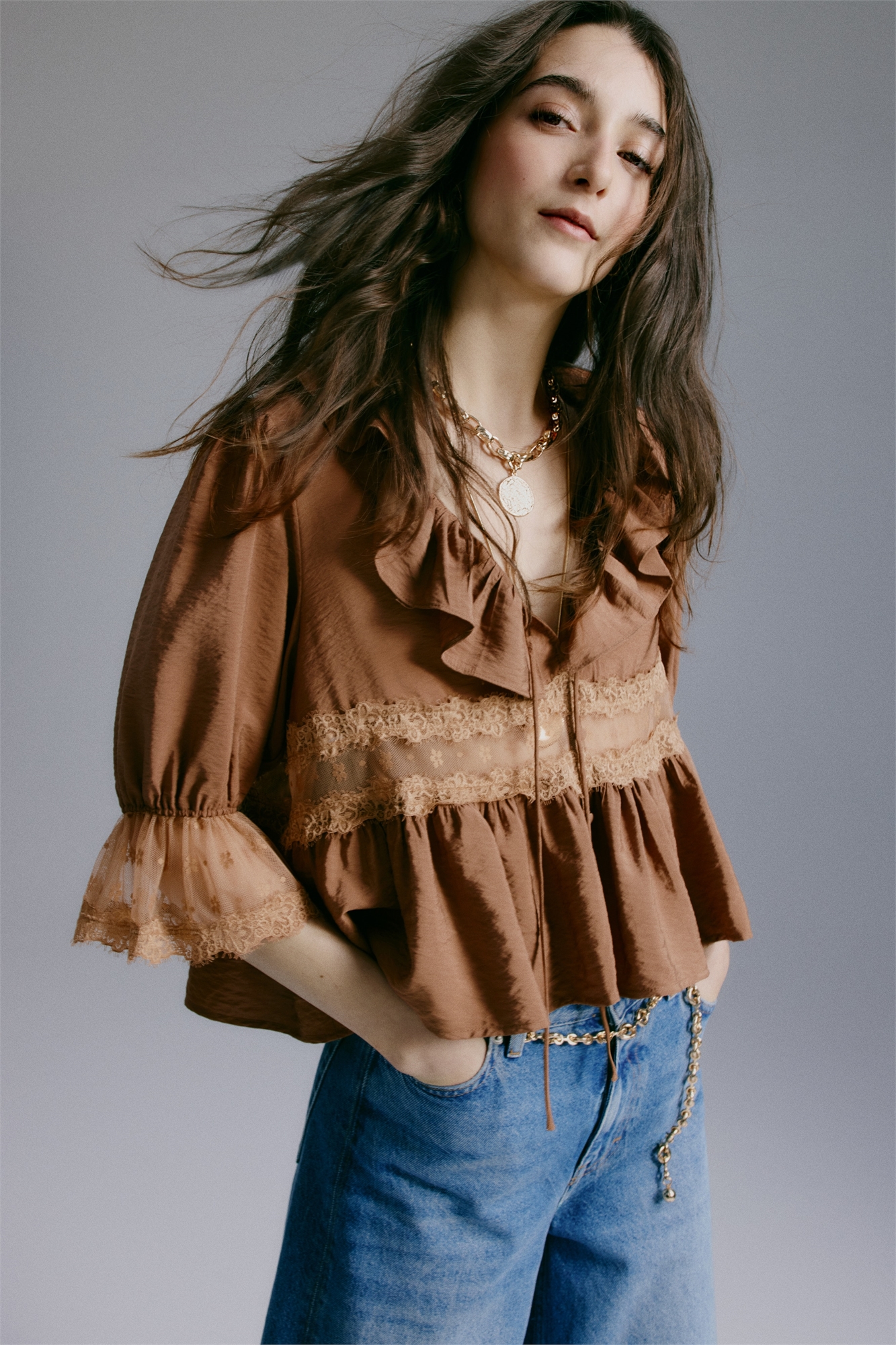 Блузка из тканого материала с глубоким, отделанным воланами V-образным вырезом с узкими завязками спереди. Застежка на пуговицах спереди, нежная кружевная панель на талии и расклешенный пеплум. Рукава длиной до локтя с узкой резинкой и кружевной отделкой на манжетах.