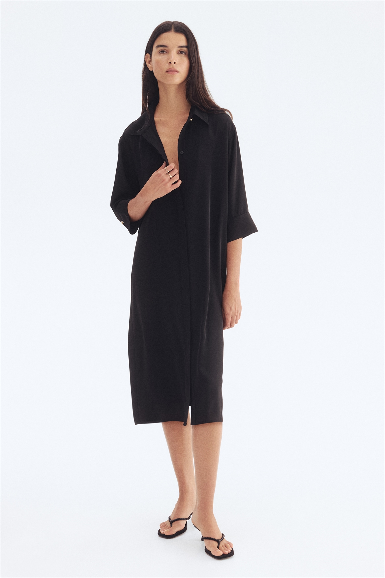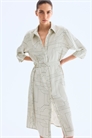 Платье-рубашка длиной до колен из мягкой саржи с воротником и потайными пуговицами спереди. Спущенные плечи, рукава длиной 3/4 с манжетами на пуговицах и съемный пояс с D-образными кольцами на талии. Без подкладки.
